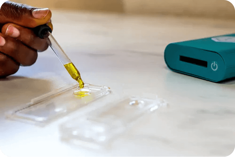 Place a small sample into the testing tray. If starting with flower or concentrates, a quick infusion can be made using the